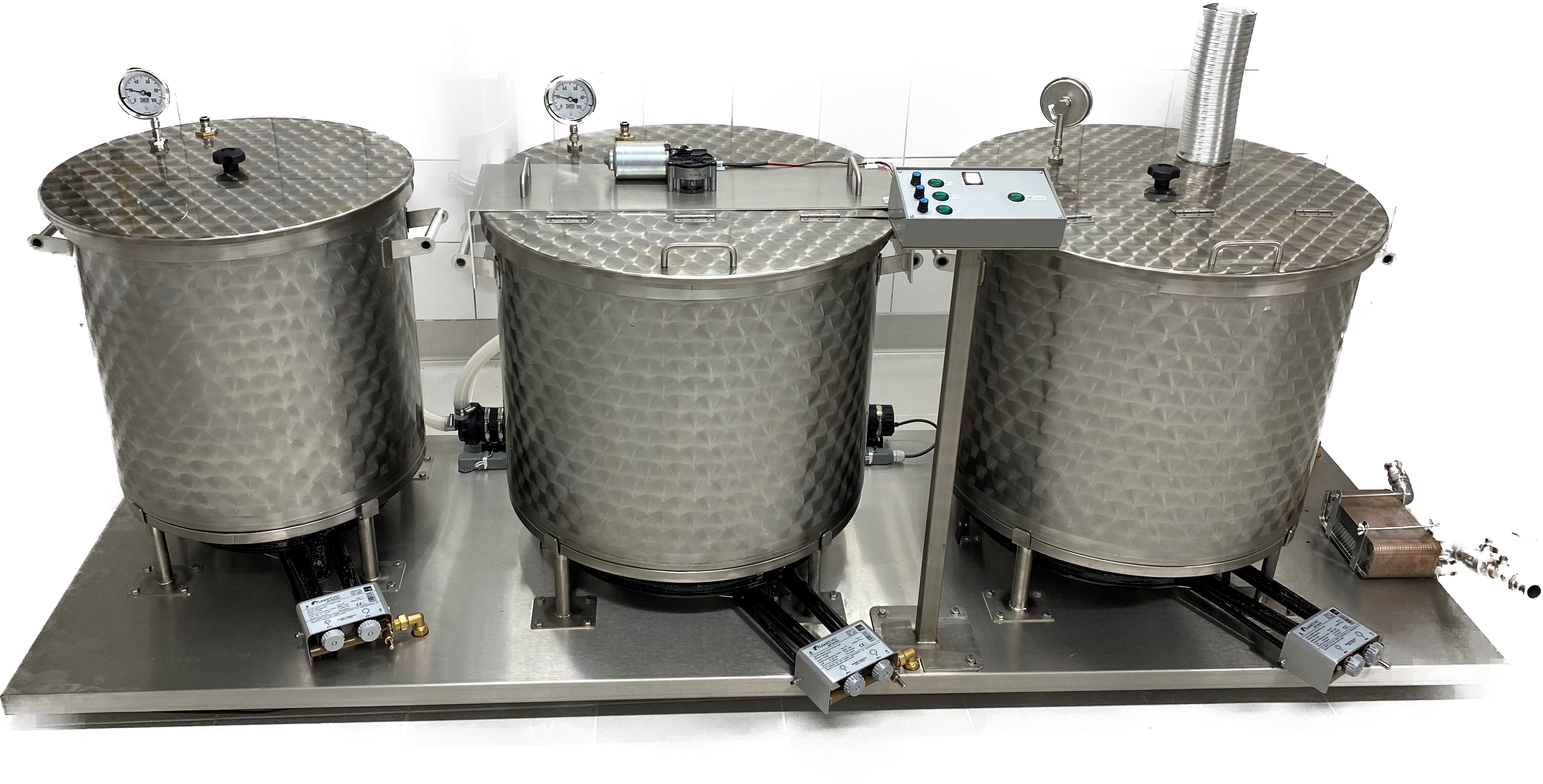 Dans cet ensemble, nous construisons dans notre atelier d'Etrepagny (et non plus Chaumont en Vexin) la partie chaude, à partir de cuves nues fabriquées spécialement par Ghidi srl en Italie, et la régulation de température selon une conception personnelle.